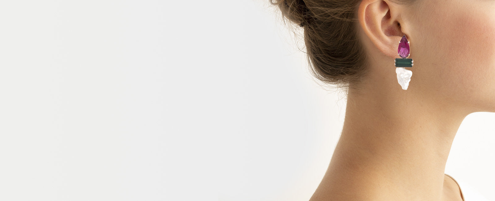 These beautiful earrings feature wonderful bright and charming rubelite tourmaline juxtaposed with deep green emerald cut tourmalines. The asymmetrical tourmalines are accentuated by teh irregular shapes of the south sea keshi pearls. Note the playful under-over design.