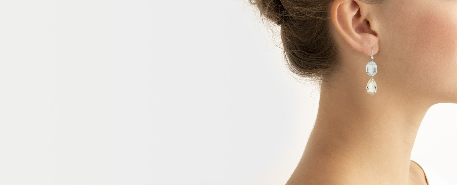 Playful soft blues and greens are juxtaposed by their various shapes. The droplets hang from beneath the subtle blue ovals.