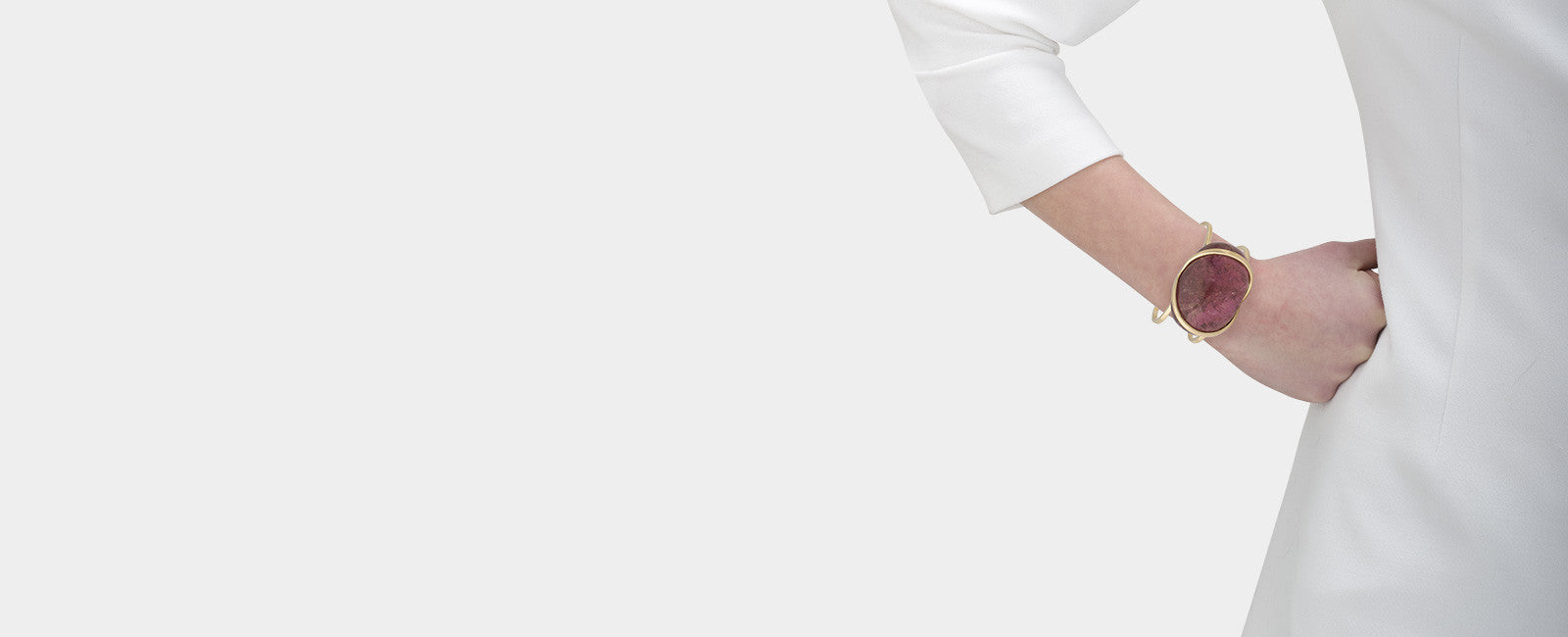 This large red tourmaline is strapped in 18k gold making for a very bold but sporty look. The banding is meant to be humorous and light hearted to emphasize the crazy size of the stone. Wear it with jeans or dressed up.