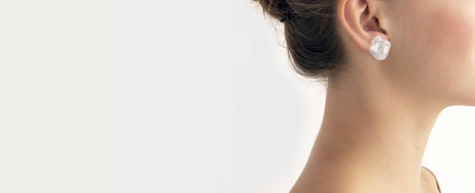 They have an asymmetrical baroque shape that is so chic and modern. They are also rather flat, so that they hug close to the face. The pearls are very white so that they glow strongly, making them rather formal. And, they have a track so that they can support a drop. These beautiful pearl earrings have it all. They are a staple in any wardrobe. Wear with silk or leather.