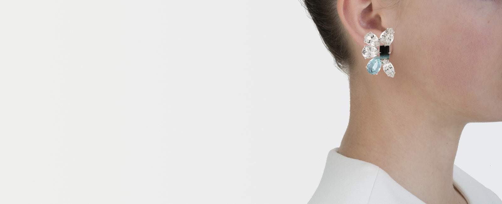 These beautiful clip earrings feature large European faceted danburites from Mexico. The dark indicolite tourmaline centers contrast and illuminate the blue aquamarines. Clustered around the ear they frame the face and shimmer in the light.