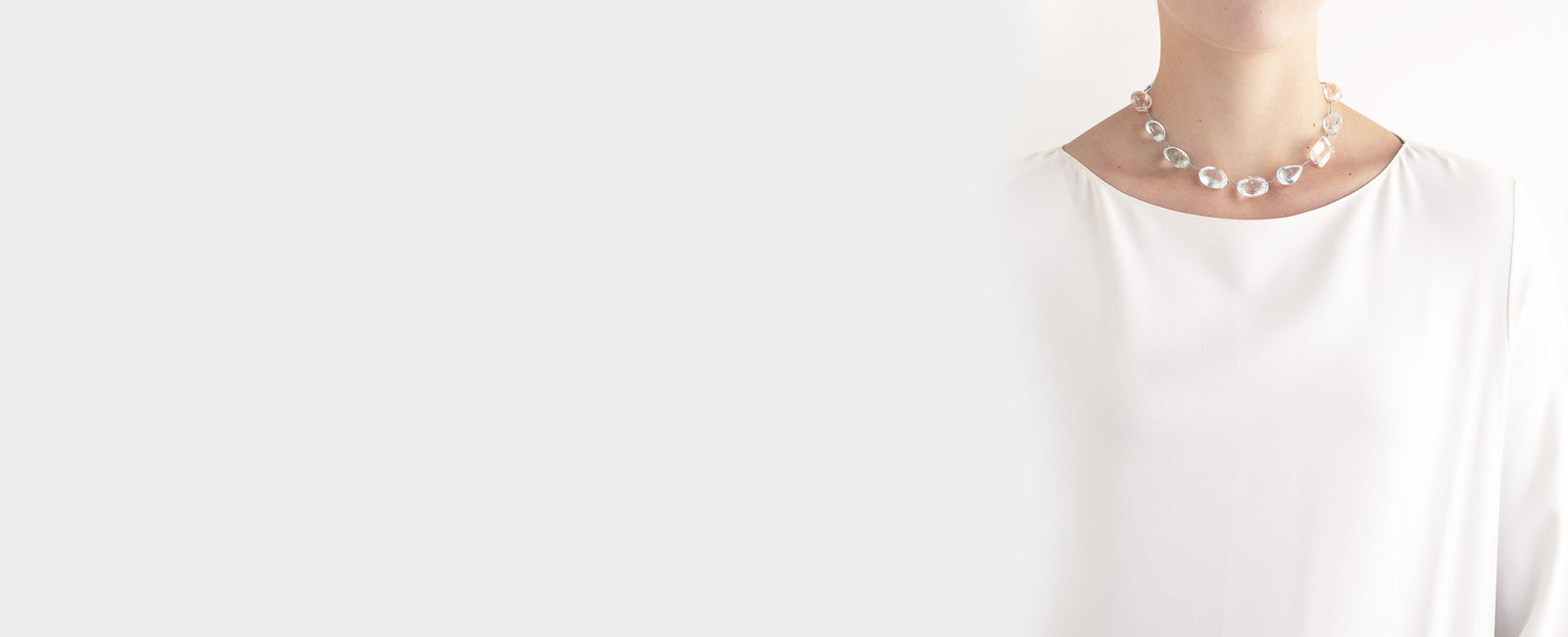 On the skin, the chain disappears and the necklace seems to float. This one especially so because the stones have only a hint of color. Glowy and subtle, it is a wonderful neutral piece that can be layered or worn anytime, day or night. The rectangular stone gives this piece a modern flair and a sense of humor. The look is young, modern polished and fun.