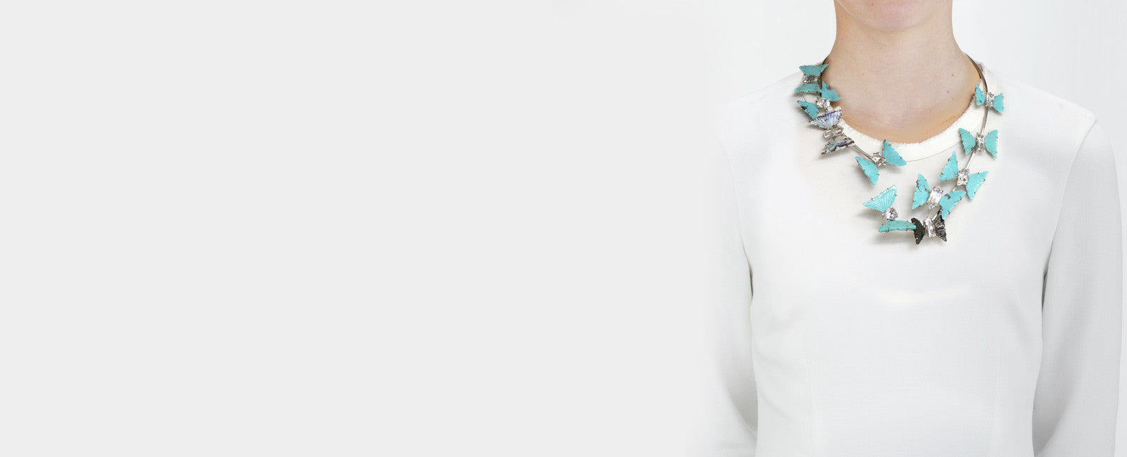 This whimsical necklace is not sweet, despite the charming theme. The colors are extremely elegant and rather serious. The effect when it is worn is startling because of the strong color and graphic design. The glittery, expertly cut danburites sparkle and dematerialize. Dramatically, there no center to this necklace, which allows the butterflies to float to either side. There is also no clasp. The piece is a shaped cuff that sits miraculously smoothly on the neck. Pull the metal slightly apart to slide it on.
