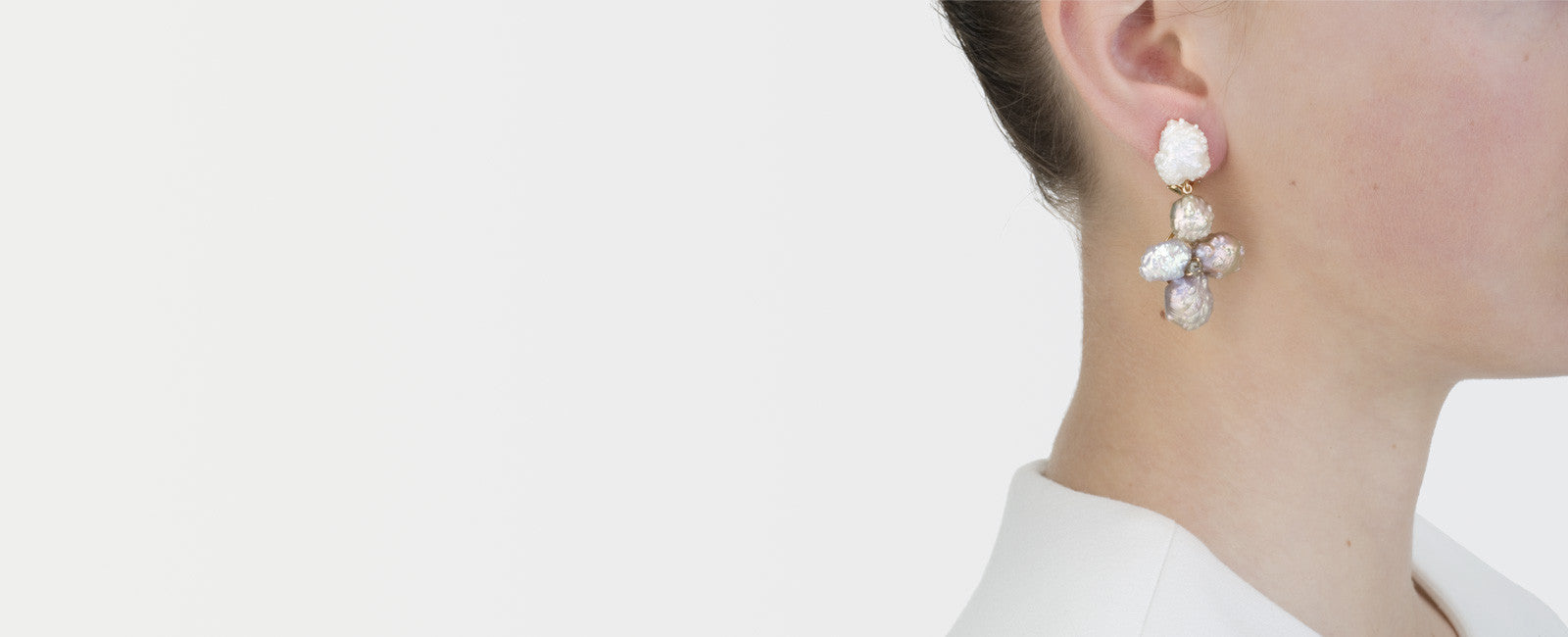 Silver, mauve, pink, gold are offset with a champagne diamond in the center. The design is influenced by renaissance jewelry that often included natural pearls. The drop is hinged for movement and modernity.