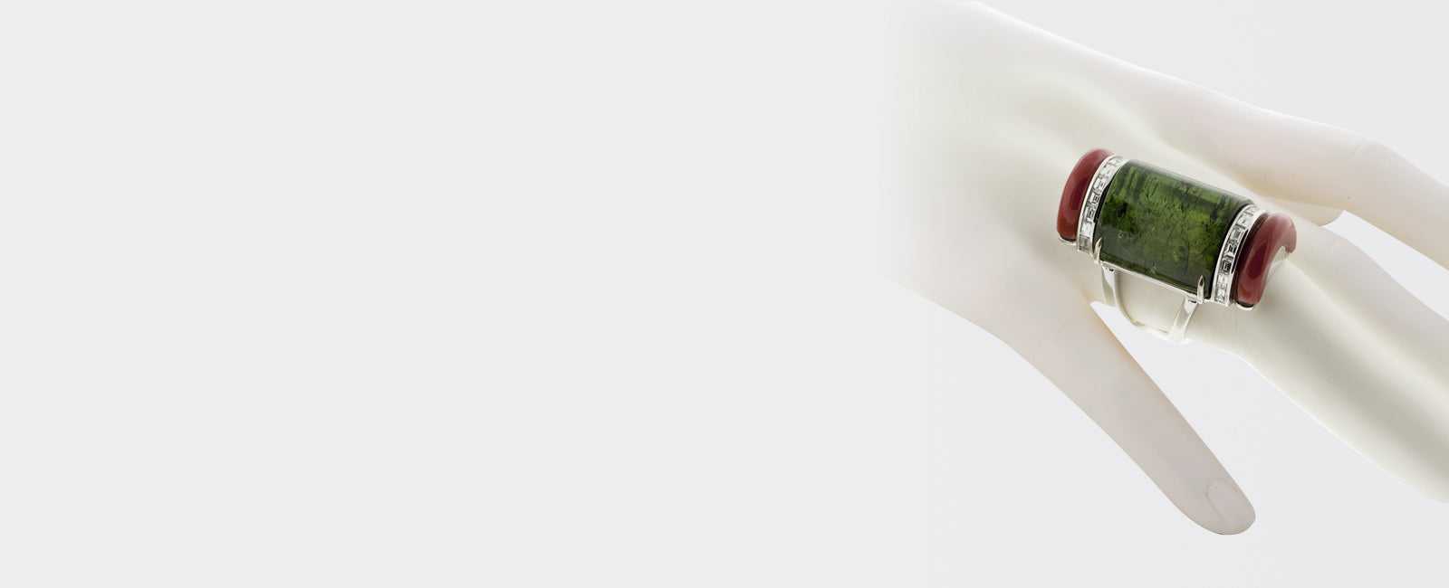 This green tourmaline is set witht antique coral and diamonds. It is based on Cartier’s iconic black/green designs of the 1920’s. The scale of this ring is large and strong, it is not delicate. The tourmaline is cut as a barrel, so the ring hugs close to the finger with a dramatic curve to the stone. This romantic ring is meant to be worn during the day to bring expression to black clothes, black pants, black jeans. Or wear it with dramatic earrings for night. The accent is mysterious and evokes the romance of China.