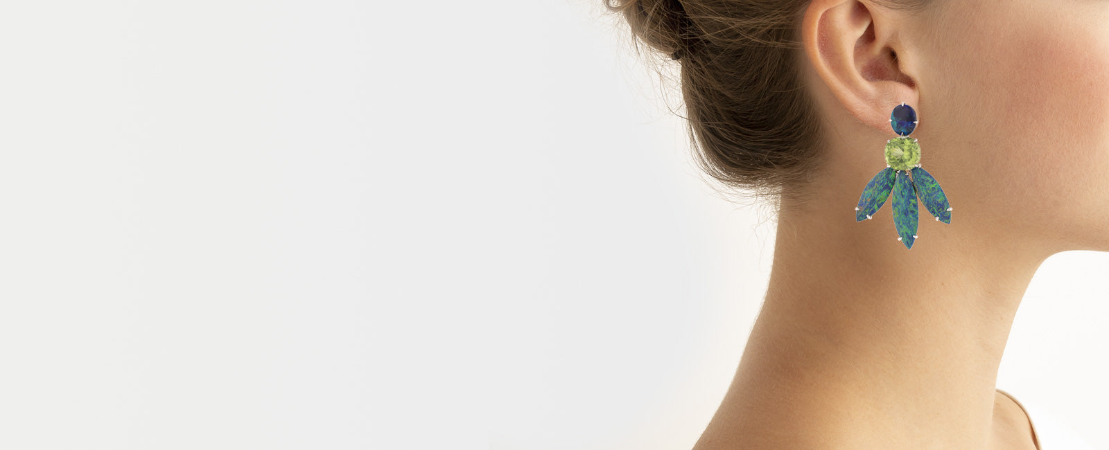 Note the intense green, blue and charcoal tones in the opal. The juxtaposition of colors and different reflective qualities of the stones is the hallmark of these elegant swinging earrings. They can be worn to highlight the blue or the green of the design, depending on which side of the face they are worn. Inspired by the sea colors of the caribbean, they seem to capture the summer.