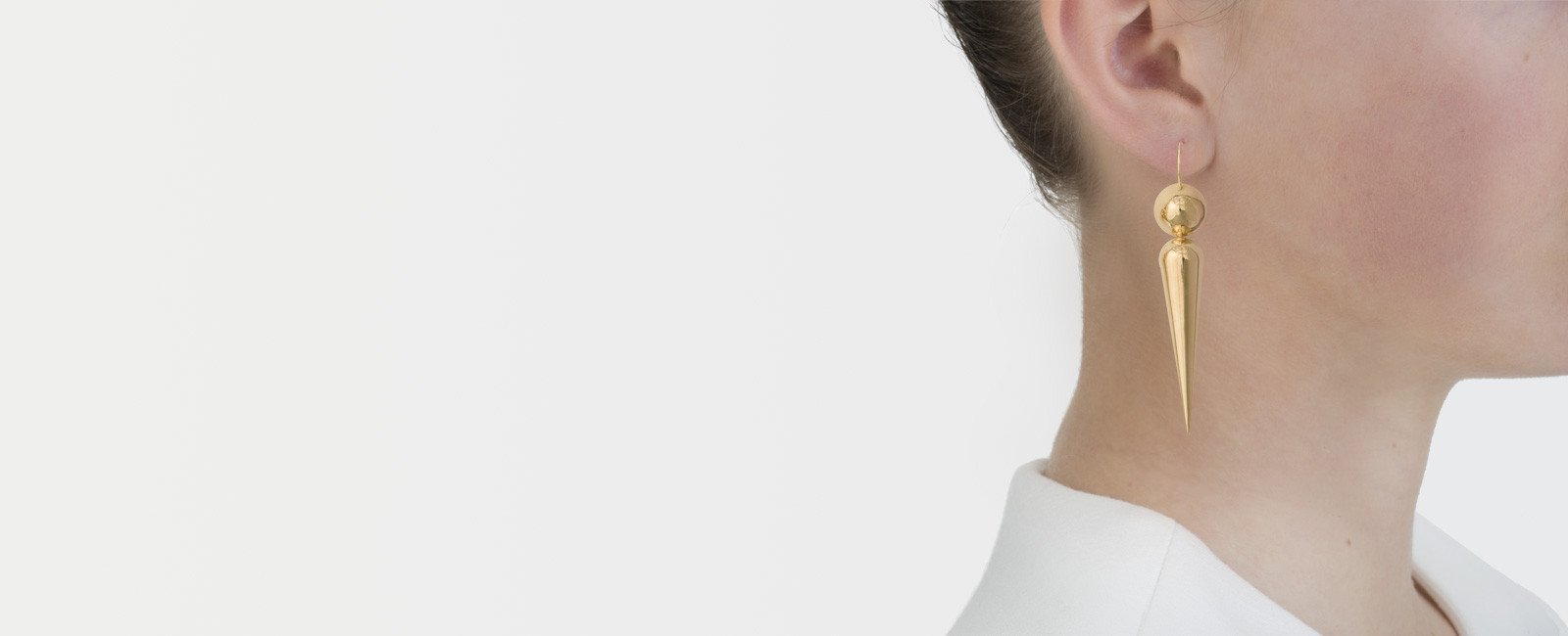 These long gold earrings make a statement while being comfortable. The disk on top is convex and stepped while the "tassle" below is three dimensional and swings gently. Made of thick polished 18k gold, they are a refreshing accent to wear... with anything.