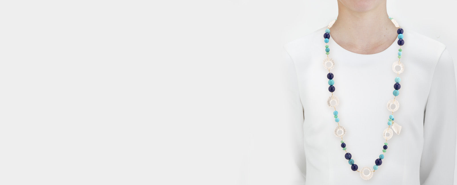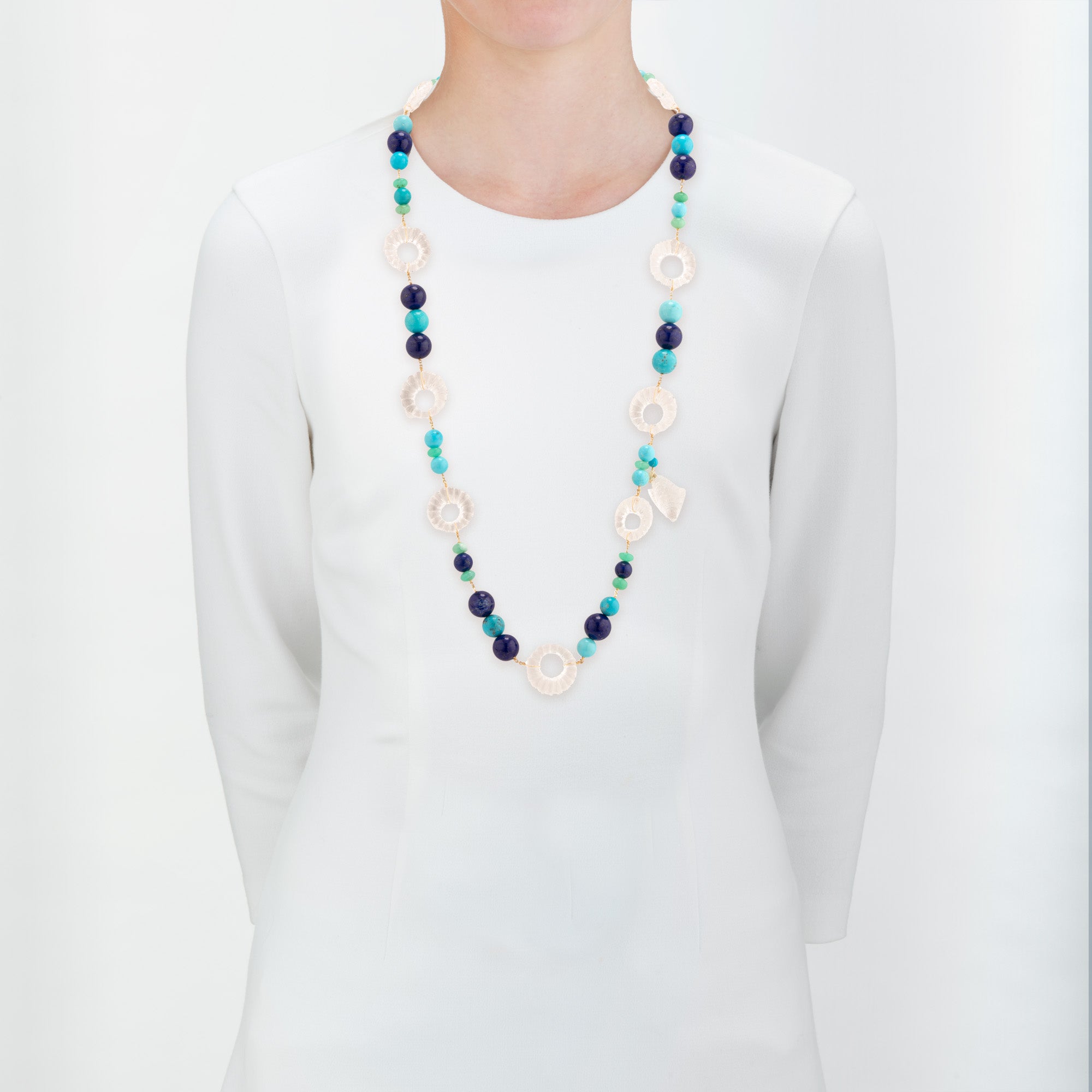 This is a playful necklace with classic blue combinations. It can be worn short or long. The varying size of cabochon balls and crystal disks cascade around your neck. The design follows this idea. It reflects the abundance, the grandeur, the history, culture and unpretentious beauty of the magnificent American West combined with the dark blue mysteries of the east.