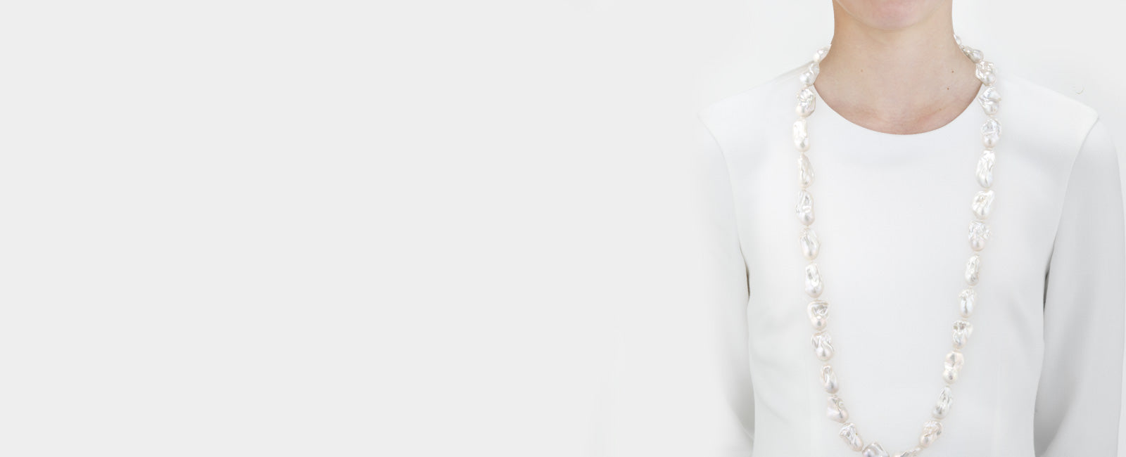 This strand of large bright white fresh water pearls is fun and dynamic. The rippling lustre of the pearls reflects light and shimmers. Wear it long and swinging or shorter and tight, day or night. FUN.