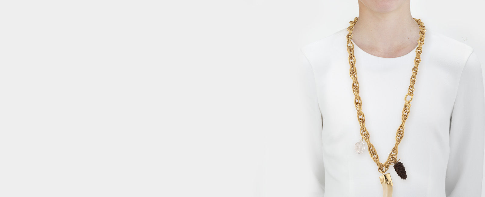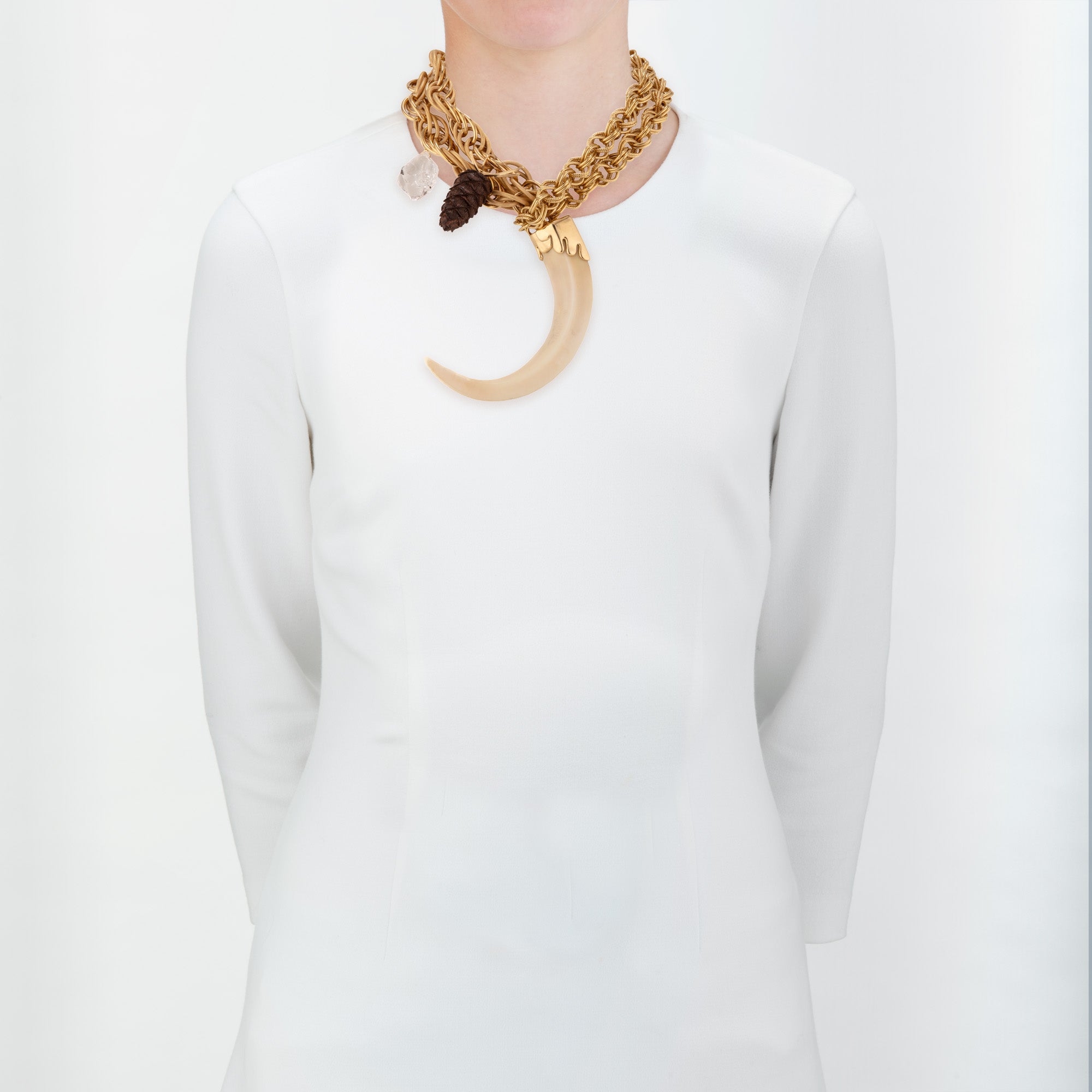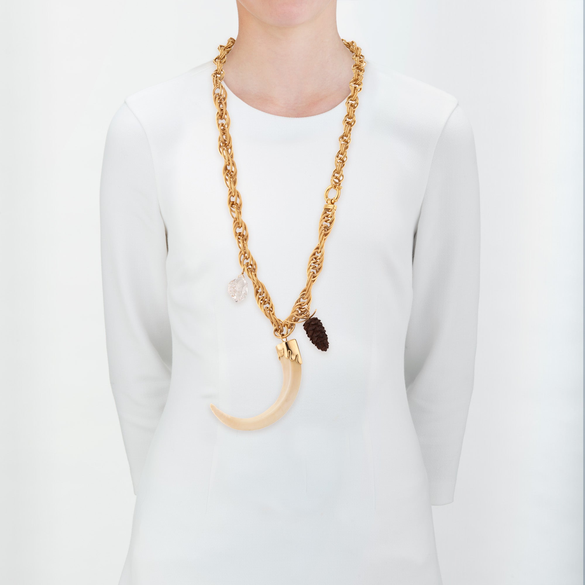 This necklace from the goddess collection is a talisman of wild elegance and quiet power, channeling the untamed spirit of the peaks and the refined audacity of icons who lived without apology. A Polish boar tusk—ancient, curved, ivory-pale with subtle golden undertones—serves as the bold central relic, an homage to Diana the fierce godddess of fertility and the hunt. Vreeland herself might have worn this slung across a crimson caftan, its raw organic curve a defiant statement against the ordinary. Flanking it, an ebony pinecone, dark and precisely sculpted, whispers of eternal renewal. Completing the composition, a radiant Herkimer diamond from New York's ancient dolomite pockets sparkles with unparalleled clarity and high vibration, a crystalline beacon of purity and atunement that catches light like a secret shared between mountains and sky. Handcrafted with 18k gold settings that recede to let the materials speak, this piece is wearable strength: large-scale yet flattering, architectural yet intimate—an extension of the wearer's own bold narrative, a homage to those icons who adorned themselves as artfully as they lived.
