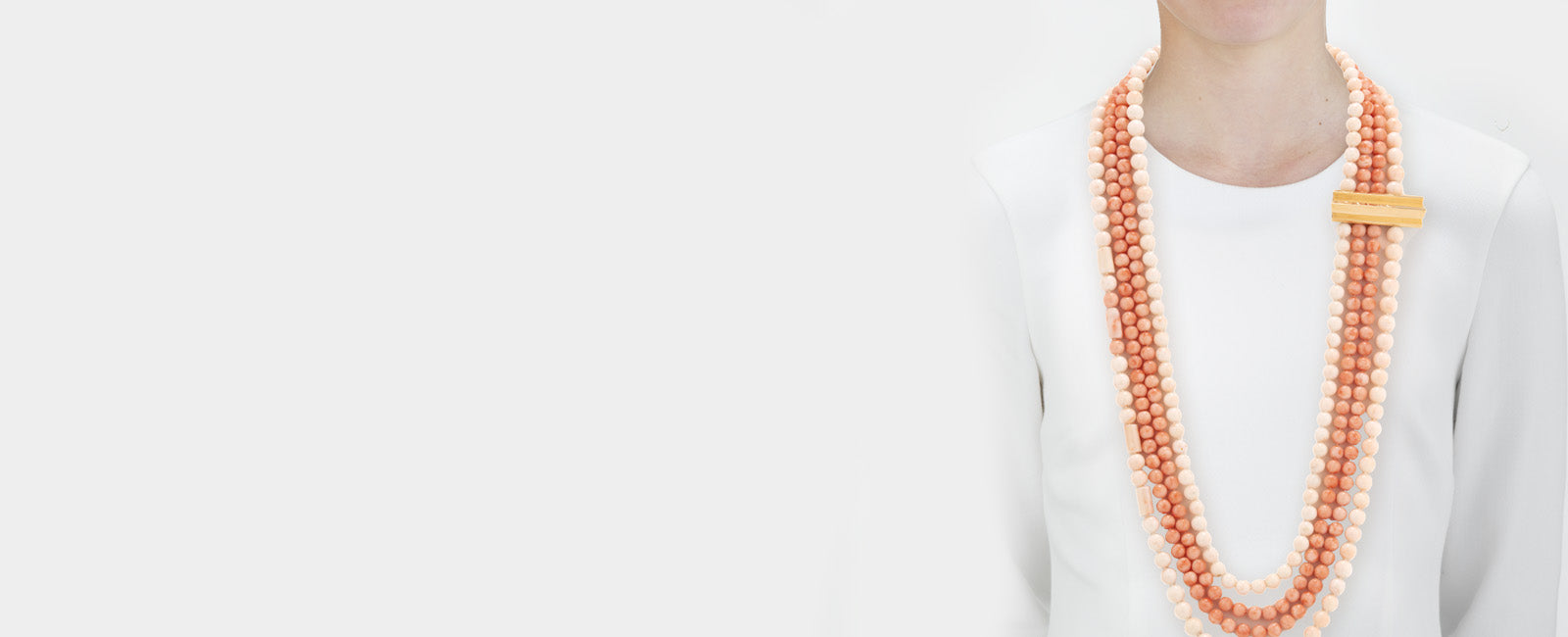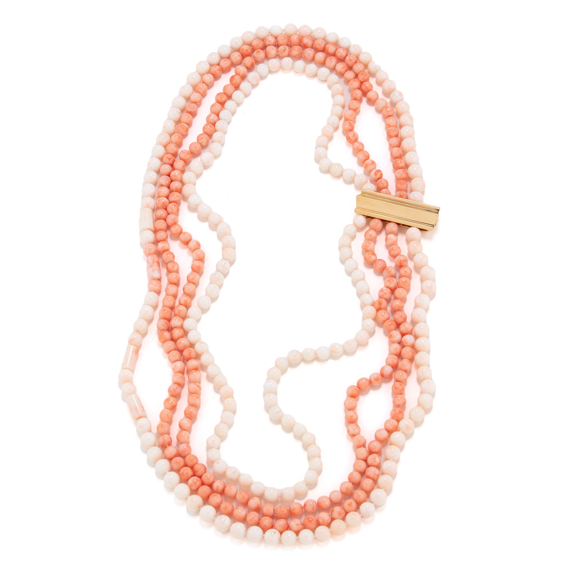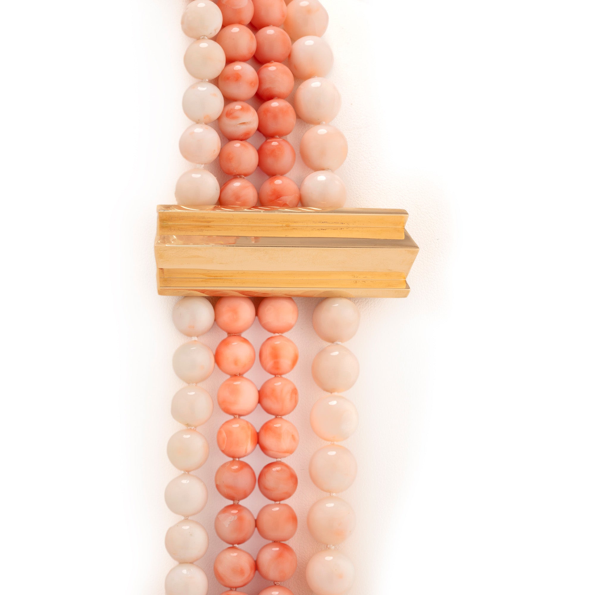 Four strands of rare Pink and "Angel skin" coral from the 60's are draped or wrapped like a lai. You cannot help but marvel at the treasures of the sea. Wear it in the summer, at the beach or when you just want to be chic.