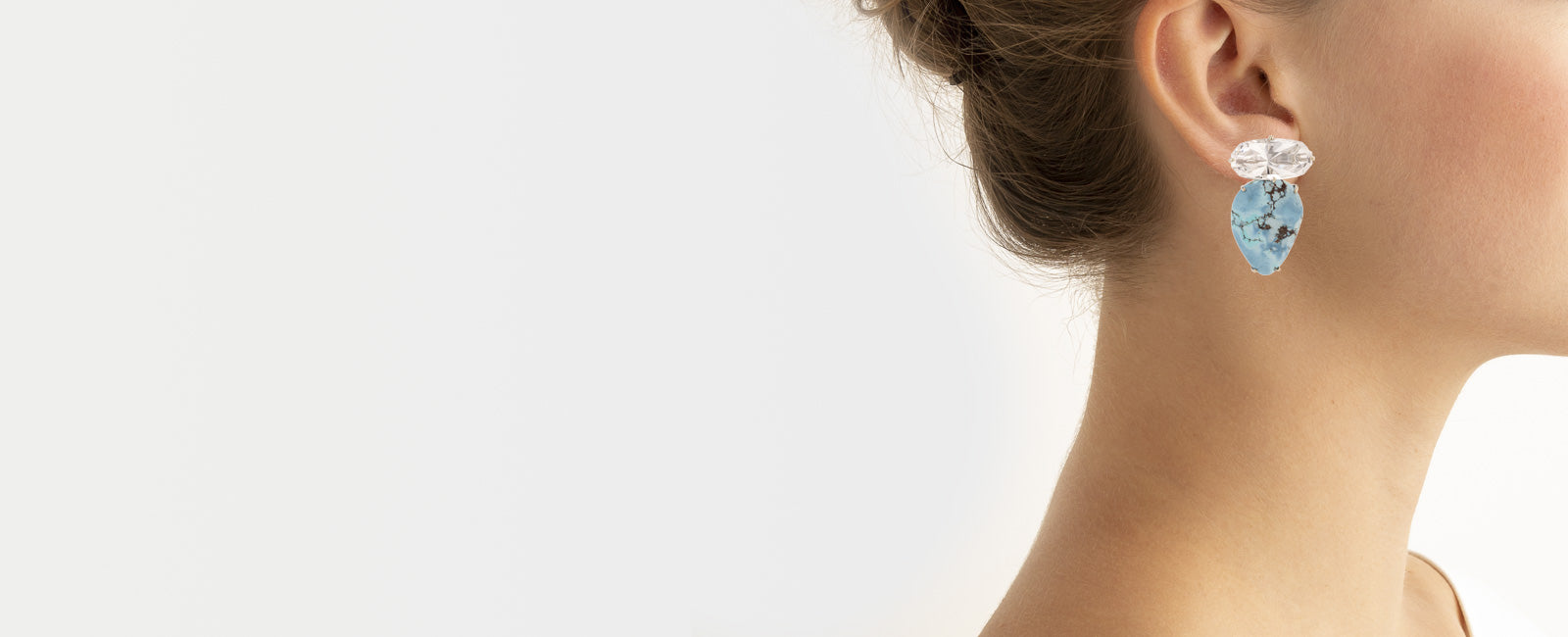 Chic asymmetrical danburites offset the subtle pattern of these rare Himalayan turquoise pear shaped cabochons. They have a subtle undertone of Lavendar next to the bright blue. The matrix’s rust tones create a dark web and the subtly pink Mexican danburites almost glow. They are sporty and formal at the same time and their scale is very flattering.