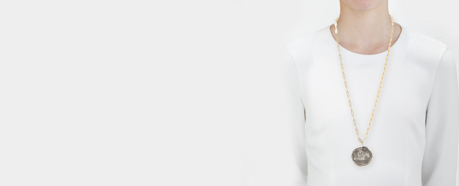 The coin is an actual Piece of Eight minted in 1625 in Peru. It was recovered from the Dutch Spice Islands wreck of 1629. The setting is hand wrought gold to underscore the drama of the coin. It is wonderful piece of history and beautiful as well. The coin can be worn with either face forward and the colors of the silver the gold and the black tarnish are a classic and elegant combination. The length should be adjust for the owner of this piece…either long or short, almost choker length. It is an interesting and tough-looking piece of jewelry, sporty and chic…great with a bathing suit.