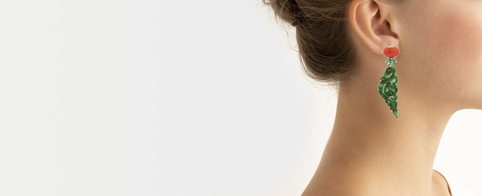 The gleaming pale seafoam tourmalines contrast with the cabochon coral and the translucent green jade. The inspiration is Cartier’s wonderful jade and enamel jewelry of the 1920’s. The earrings are perfect for summer dressing, but can be an understated accent with winter black.